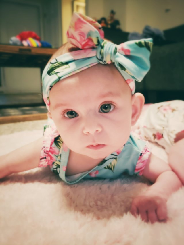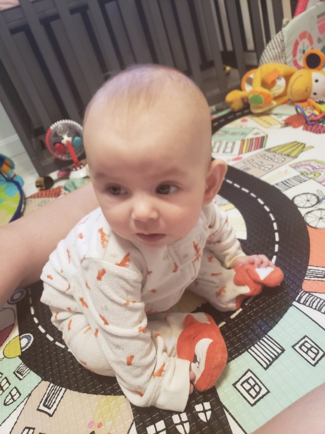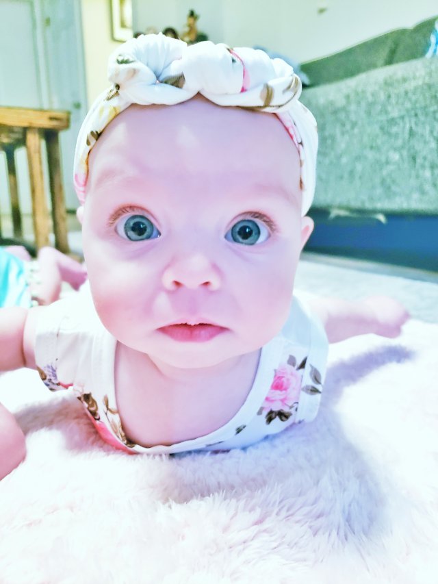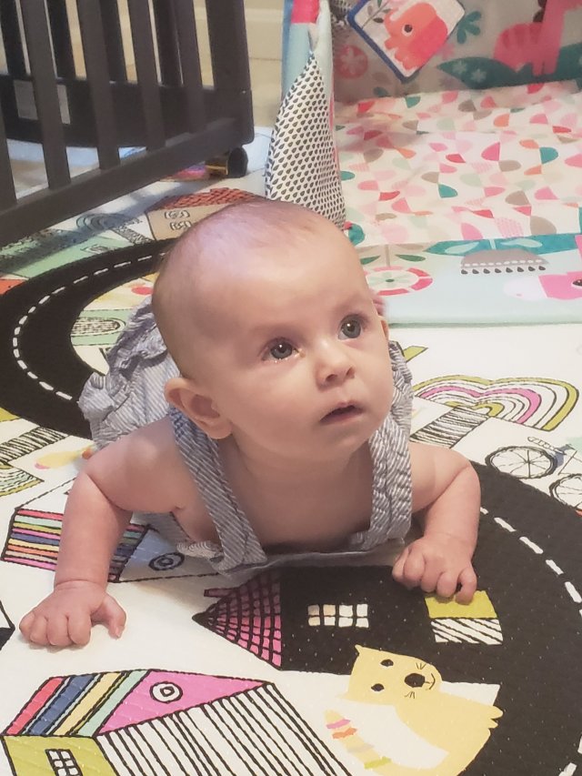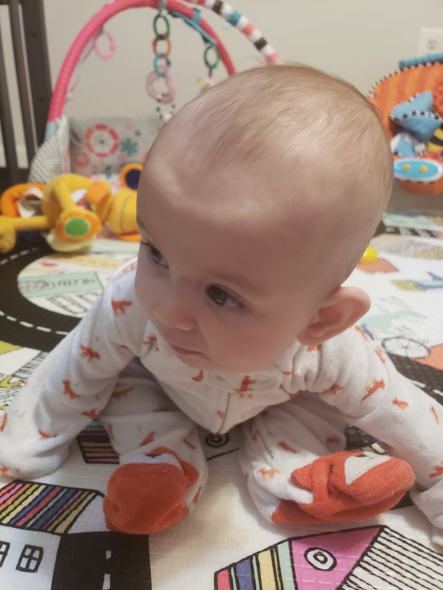 Caelyn is such a sweetie pie and has a very demure smile. She loves cuddling with momma, but daddy and grandma K are amazing also. She smiles at sissy and they hold hands all the time. She sleeps flat on her belly and has started sucking her thumb during the day a little as well. We are working on new stretches that her PT gave us and she is doing well. She loves sleep, needs a few minutes to adjust to being awake and her favorite toy is a abacus looking thing.